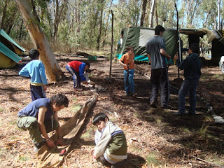 La Mañana del domingo nos encontro bajo un cielo despejado y con un sol radiante. Despues del Ansiado desayuno y la gimnasia de la mañana era hora de empezar a darle forma al campamento.